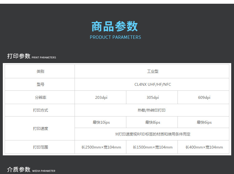 | 打印参数 | 203dpi,热敏和热转印,10ips(254mm/s),104mm,2500mm |