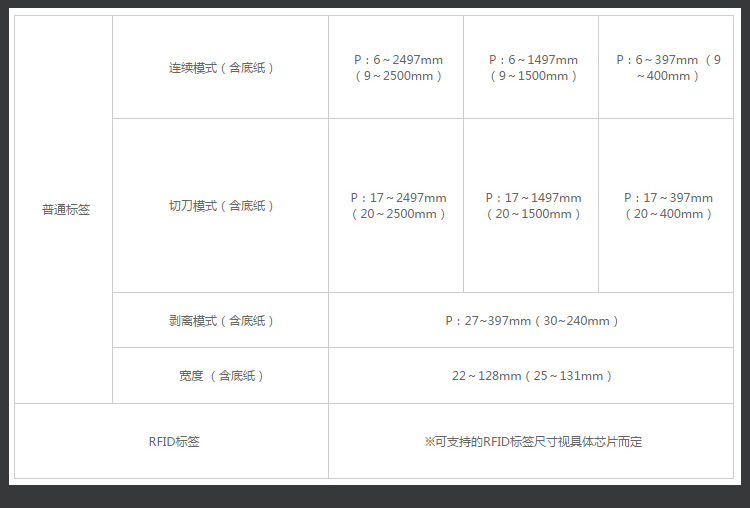 | 其它性能 | 打印模式:连续、撕纸、切刀、剥离 感应模式:间隙感应(穿透模式)、黑标感应(反射模式)、纸张用尽、碳带用尽、碳带即将用??; LED指示器:蓝/红色 警报声音:蜂鸣声(3级音量) 自检功能:打印头、切刀开启,待机,自动检测 显示屏:TFT全彩LCD,3.5"(320x240) 多语言支持:内置47种打印语言,30种LCD显示语言 操作视频预置:18个视频(耗材安装,部件更换,清扫,设置RFID天线) 远程协议:SNMP ver3,HTTPs 构造:铝压铸(底部,框架,前盖,碳带轴,打印头装置) 机身侧盖:省空间双折叠式,含大视窗 底盘安装:3孔固定,可平面或倾斜安装 |