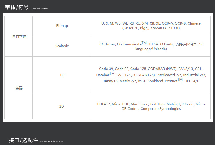 | 字符集 | Bitmap:U,S,M,WB,WL,XS,XU,XM,XB,XL,OCR-A,OCR-B,Chinese(GB18030,Big5),Korean(KSX1001) Scalable:CG Times,CG Triumvirate,13 SATO Fonts,支持多国语言(47国语言Unicode) |