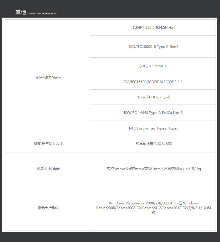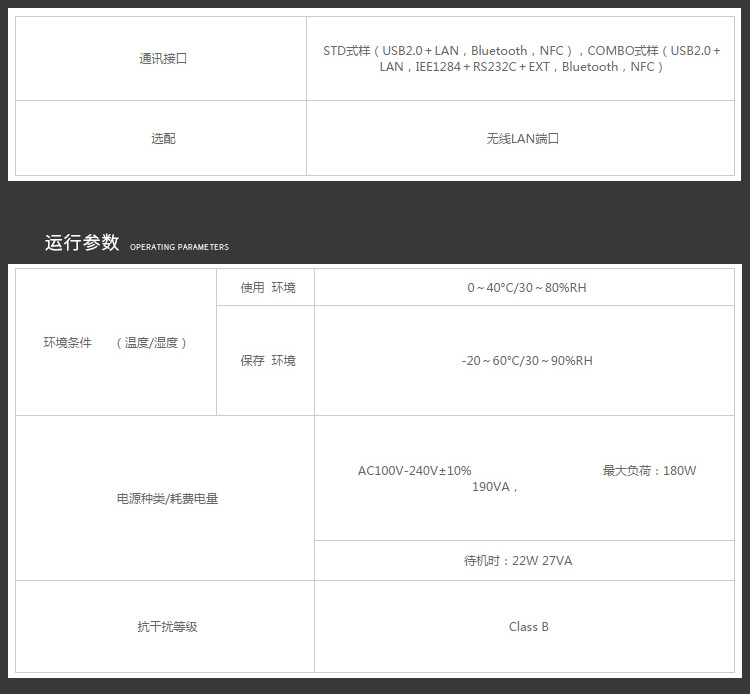 | 主要参数 | 标配:USB2.0接口(Type A,Type B),Ethernet(IPv4/v6)(机身后面),USB2.0接口(Type A)(机身前面),RS-232C,IEEE1284,EXT(标准接口板),Bluetooth Ver3.0 选配:Wireless LAN kit(Wi-Fi and CCX认证),IEEE 802.11a/b/g/n,双频(2.4GHz,5GHz),100MB,22-128mm,0.06-0.268mm,双CPU&双操作系统 CPU1:2GB ROM,256MB RAM for Linux操作系统 CPU2:4MB ROM,64MB RAM for ITRON操作系统,600m,39-128mm,25mm,工商用打印机 |